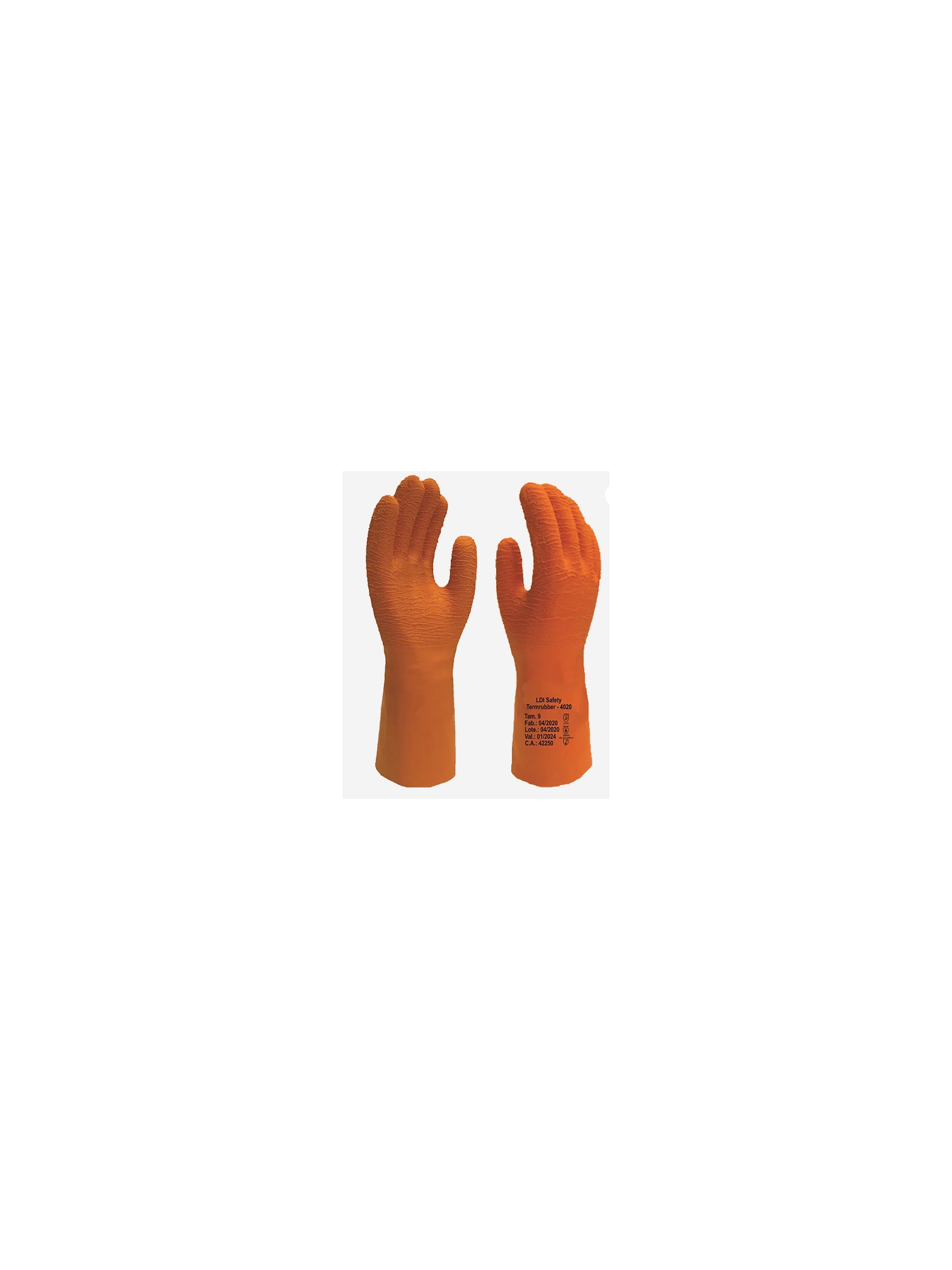 Luva de segurança confeccionada em fibras naturais revestimento total em borracha natural, acabamento rugoso na palma, dedos e dorso.