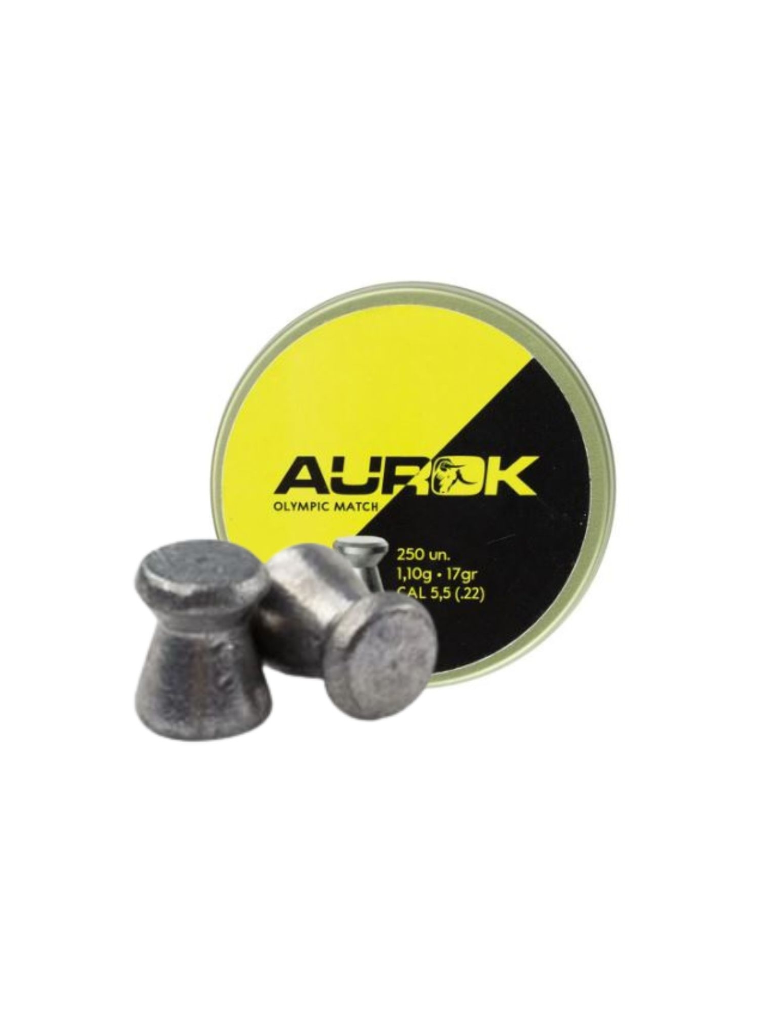 Chumbinho 5.5mm desenvolvido para tiro esportivo é um chumbinho de 17 grains de saia lisa e cabeça plana fabricado pela Aurok. Latinha com 250 unidades de chumbinho 5.5mm (.22).