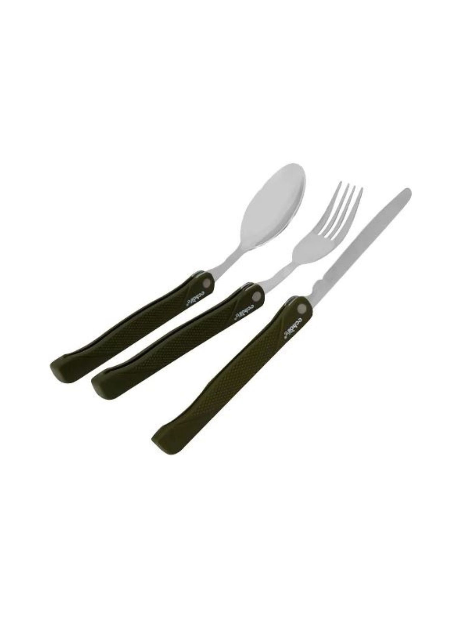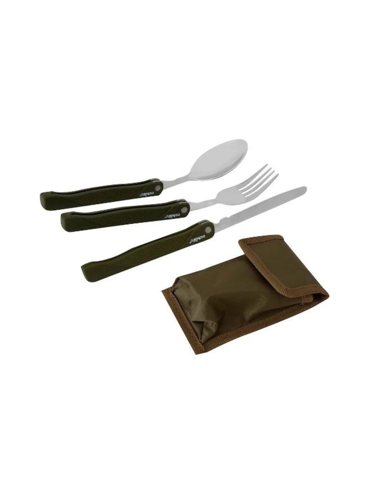 O conjunto de talheres Soldier CF005 da Echolife é ideal para camping. Possui colher, garfo e faca, fabricados em aço inoxidável para garantir a qualidade do produto e punho em plástico resistente na cor verde oliva. Conte com as três peças deste produto para pensar no seu bem-estar e praticidade. Acompanha bolsa para armazenamento e transporte.