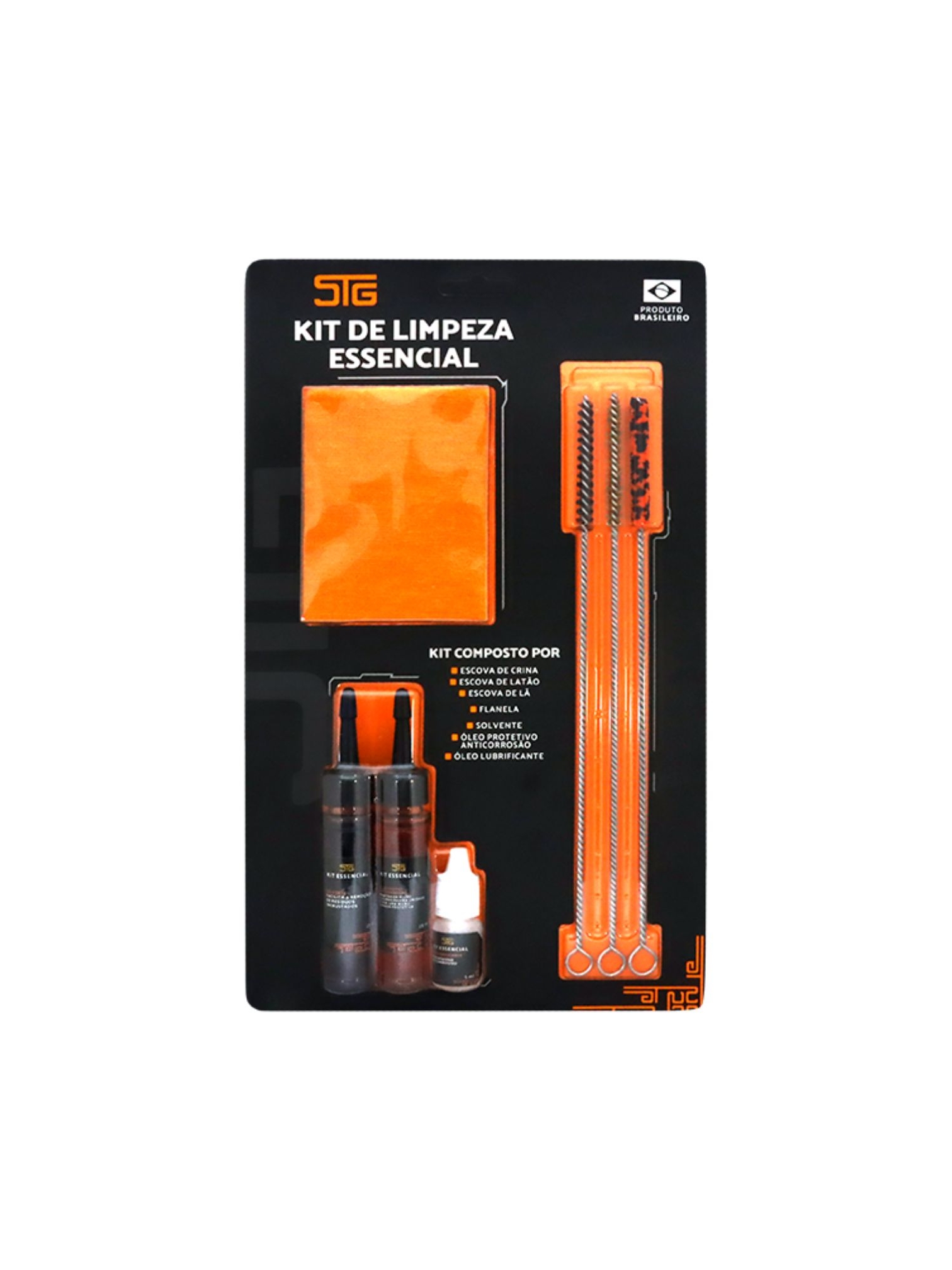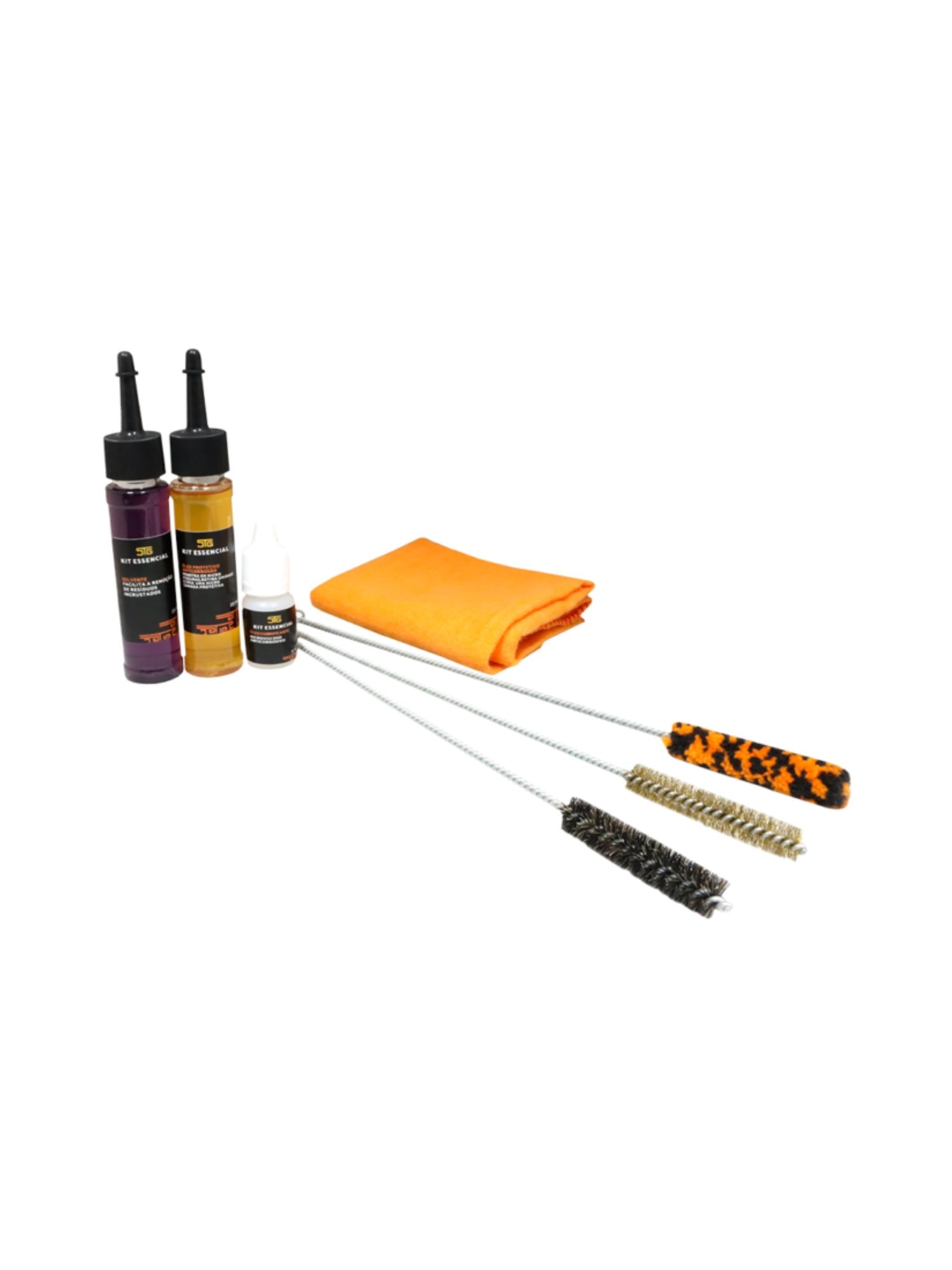 O kit possui 7 itens, sendo: 3 escovas tubulares (Crina, Latão e Lã), 3 químicos Shotgun (Solvente, Óleo Protetivo e Óleo Lubrificante) todos eles com aditivos anticorrosão e a Flanela para limpeza e retirada das sujidades.