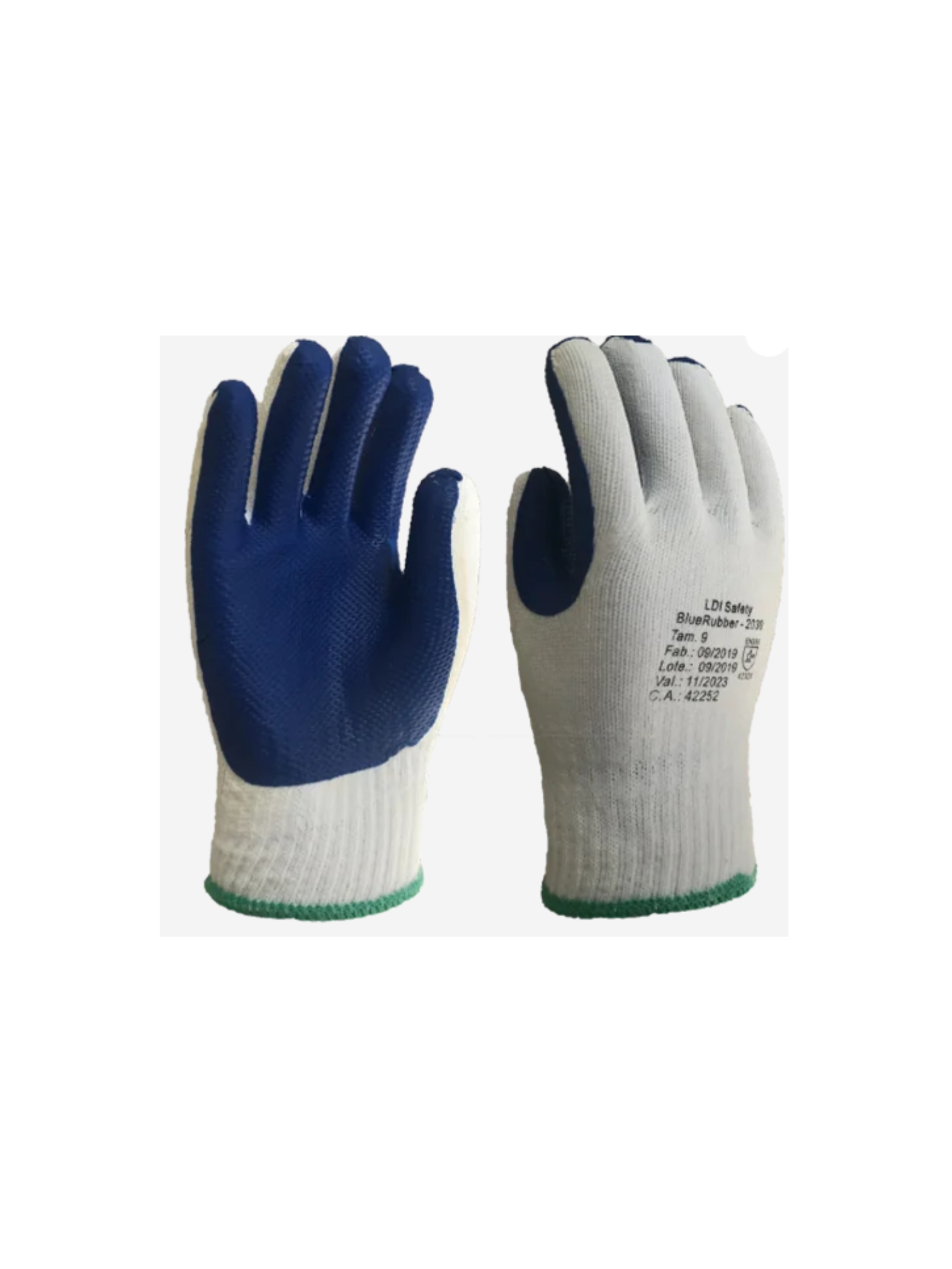 Luva de segurança confeccionada em fibras naturais e sintéticas, revestimento em borracha natural antiderrapante na palma, face palmar dos dedos e ponta dos dedos, punho tricotado nas mesmas fibras, acabamento em overloque.