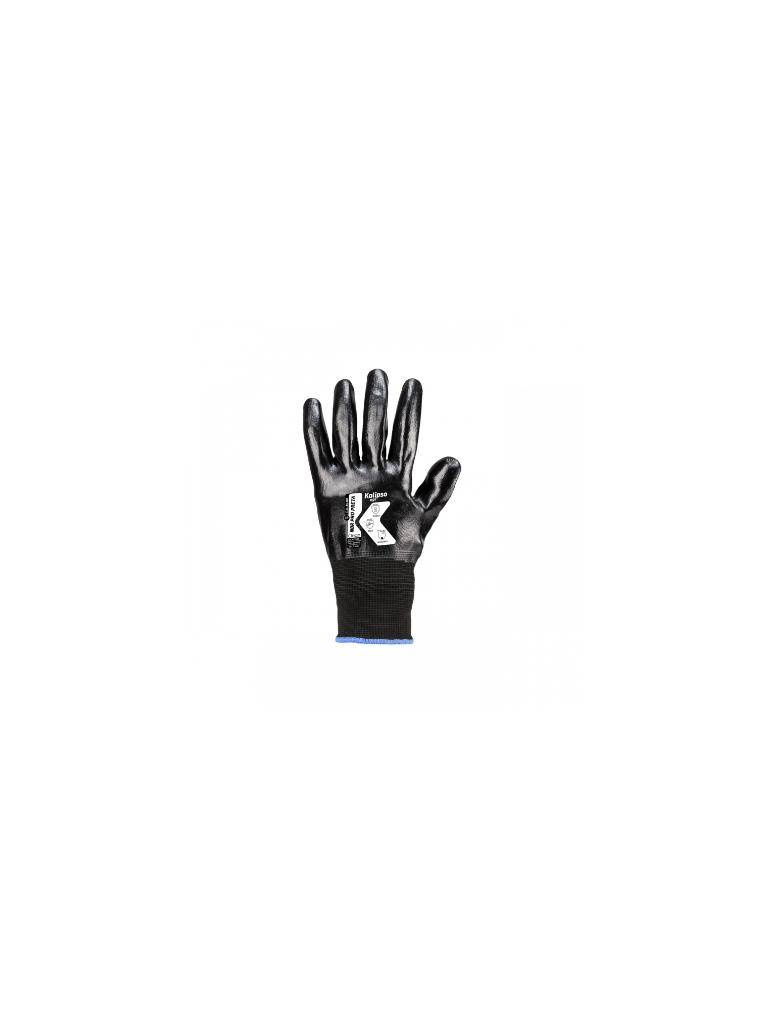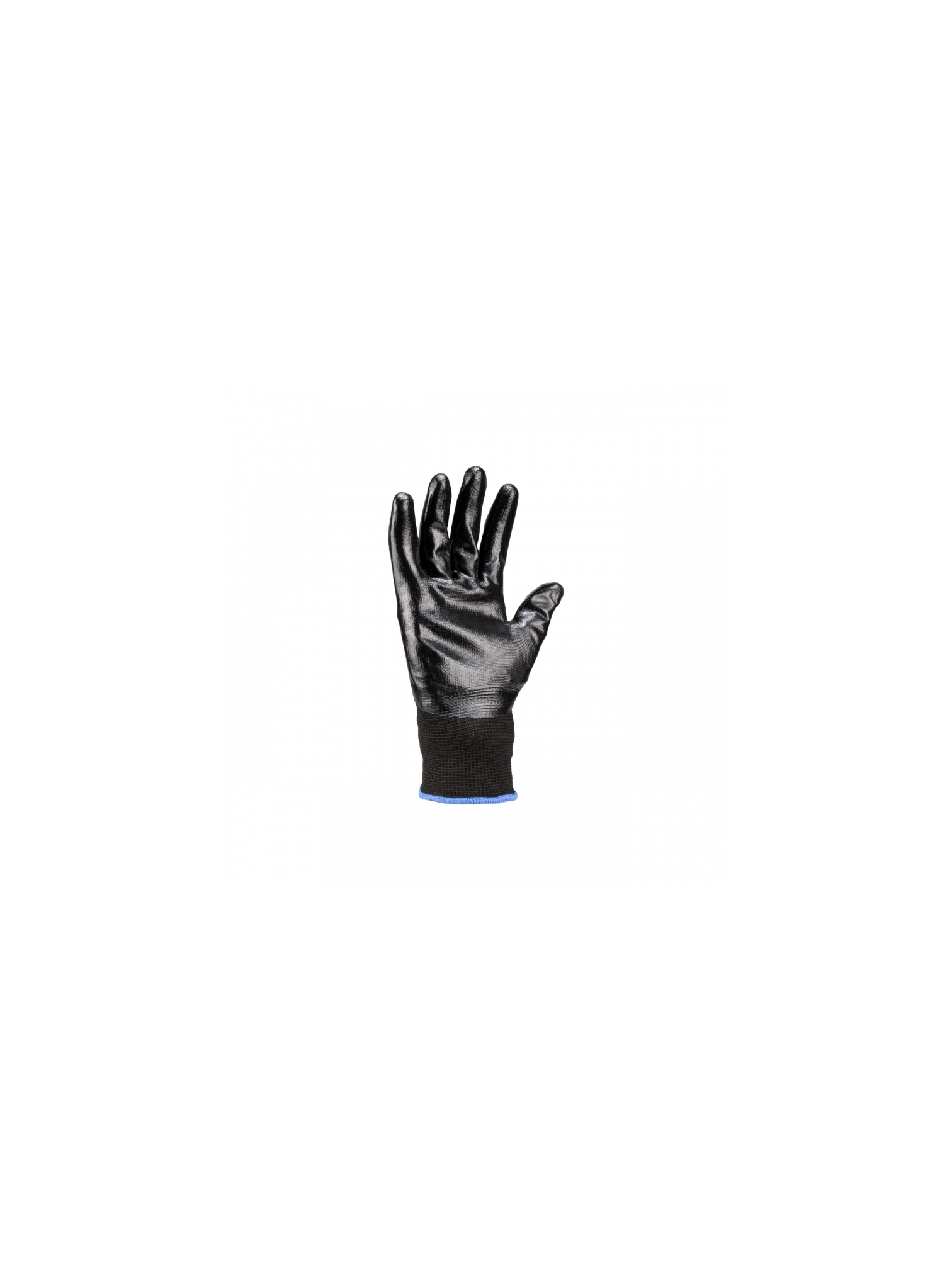 Luva de segurança confeccionada em fios de poliamida (nylon), sem costura, revestimento na palma, face palmar e dorso até a parte do punho(revestimento total) em borracha nitrílica, formato anatômico, acabamento do punho em overloque.