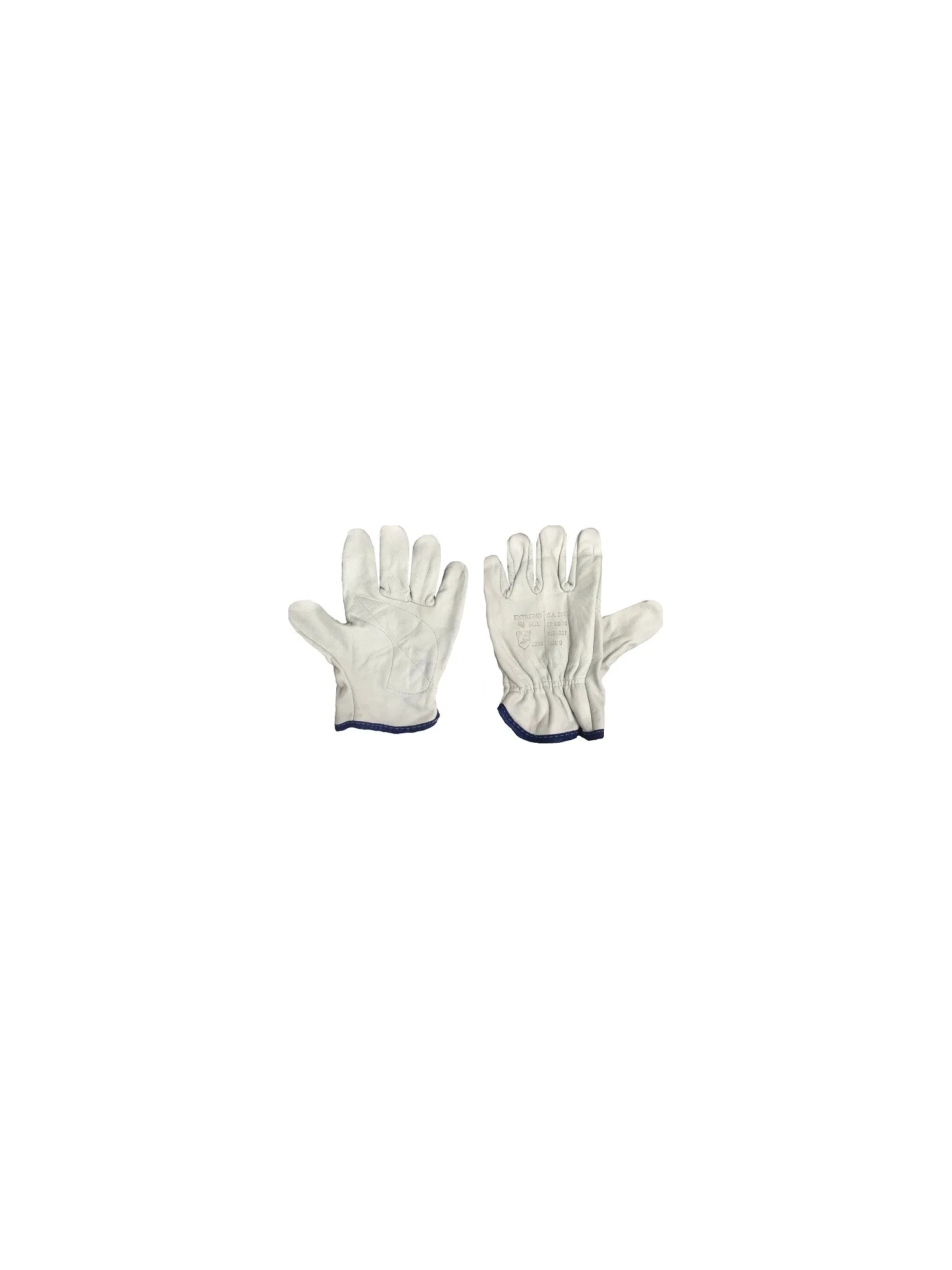 Luva de segurança confeccionada com vaqueta curtida ao cromo, formato de cinco dedos (forma L), com reforço na palma, reforço de costura entre o polegar e o indicador e entre os dedos anelares, acabamento com viés, costura com linha de nylon.