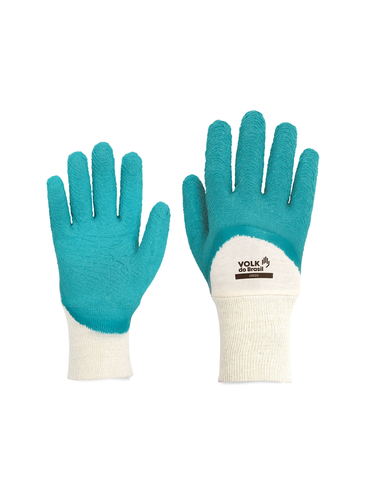 Luva de segurança confeccionada em fibras naturais tipo “interlock”, revestimento da face palmar, ponta dos dedos e dorso dos dedos em látex corrugado, punho de malha costurado.