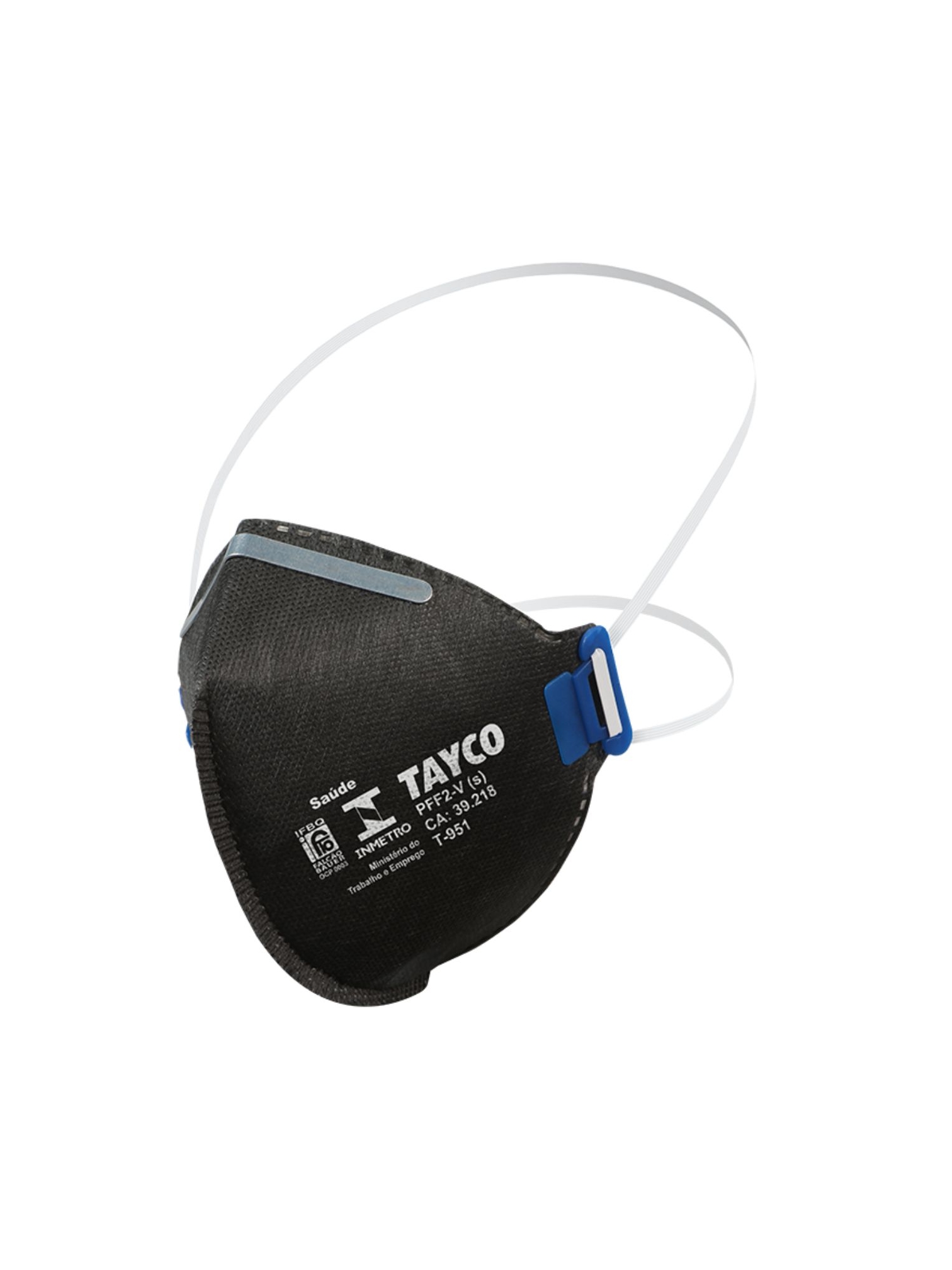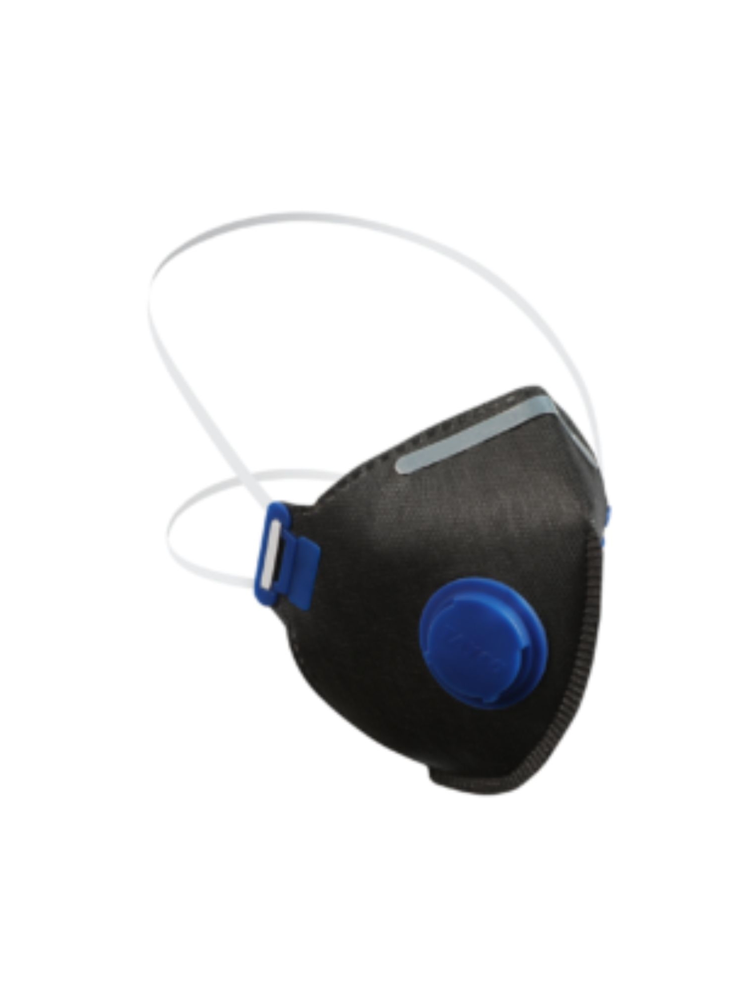Respirador dobrável do tipo PFF com válvula de exalação, possui manta com carvão ativado para alívio de odores de vapores orgânicos (abaixo do nível de ação, ou seja,abaixo da metade do Limite de Exposição Ocupacional).