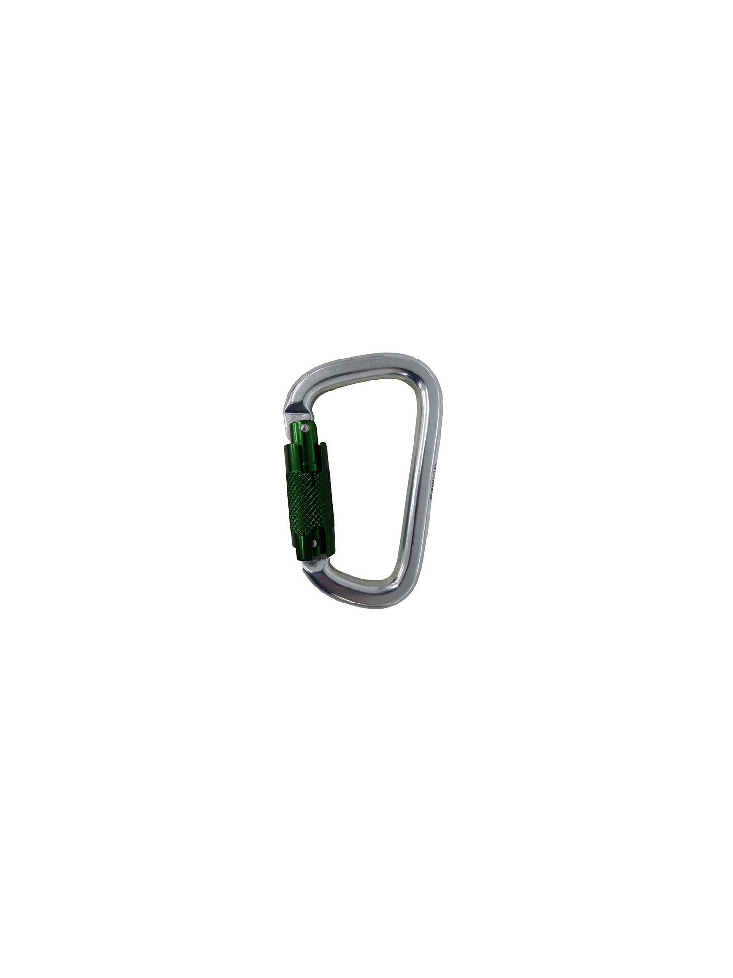 Mosquetão do tipo assimétrico é fabricado em alumínio resistente. Possui trava tripla e conta com carga máxima de trabalho de até 25kN e abertura de 22mm.