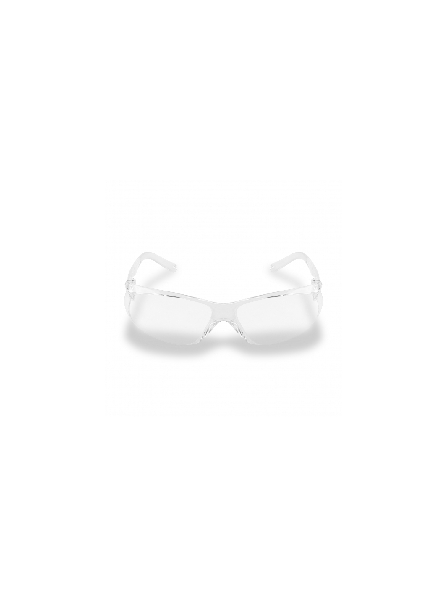 Óculos de proteção, com armação e visor confeccionados em uma única peça de policarbonato, com apoio nasal injetado no mesmo material, hastes tipo espátula confeccionadas do mesmo material do visor articuladas na armação por parafusos metálicos.