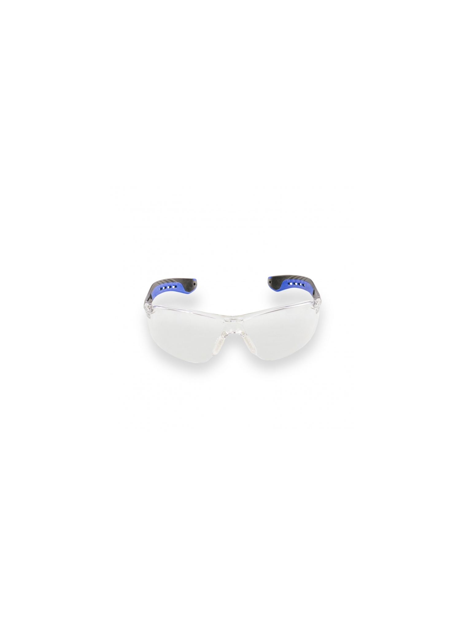 Óculos de proteção, constituídos de armação e visor confeccionados em uma única peça de policarbonato, com dois pinos localizados na posição do nariz utilizados para encaixe de apoio nasal confeccionado em borracha termo plástica maleável, hastes tipo espátula confeccionadas de policarbonato e material plástico fixadas às extremidades do visor através de um parafuso metálico com quatro fendas de cada lado para ventilação.